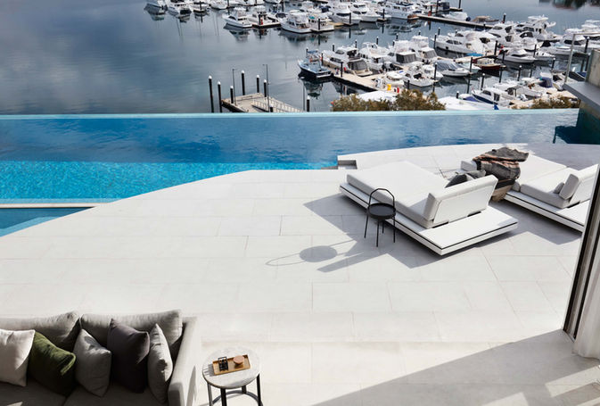 The living spaces spill out onto a generous deck with an outdoor lounge to enjoy the weather and the view in comfort, while the pool edges the property, visually merging with the sea beyond.Natural materials such as stone and beautifully finished timbers are combined with rich fabrics and colours, such as the deep blue velvet sofa and tan leather armchairs in the living room. Existing travertine stone was resurfaced to bring out its original texture and shine. An aquarium spanning across the wall from the media room to the bar creates a connection with the apartment’s seaside location. This eye-catching feature also brings a sense of serenity into the internal spaces, with the soft bubbling of water and the fluid movement of aquatic life.
